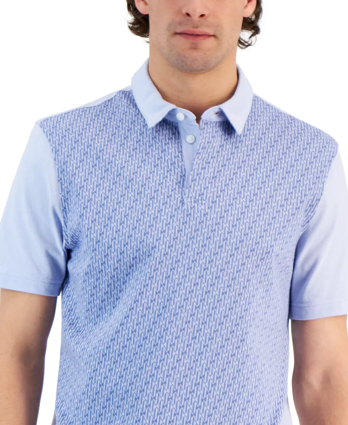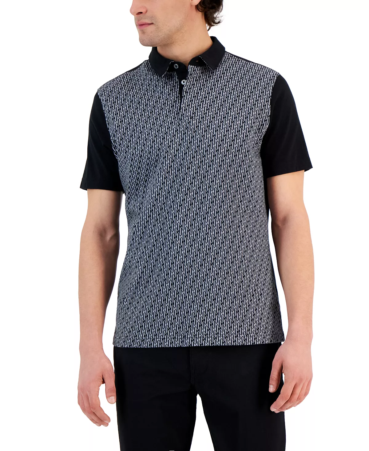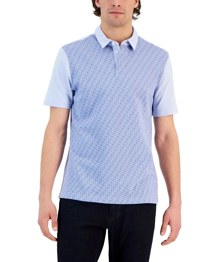 Making style happen on and off the links, this geo pattern polo shirt from Alfani is in a modern, colorblocked design with a three-button placket and short sleeves.