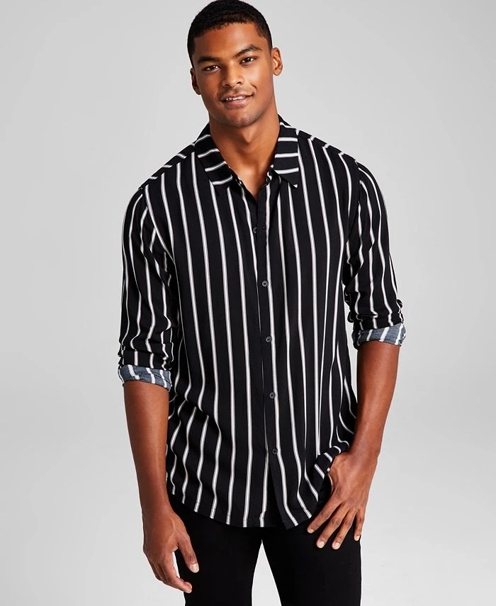 Soft fabric and a striped body set the stage for smart, evening-ready style on this long-sleeve resort shirt by And Now This.