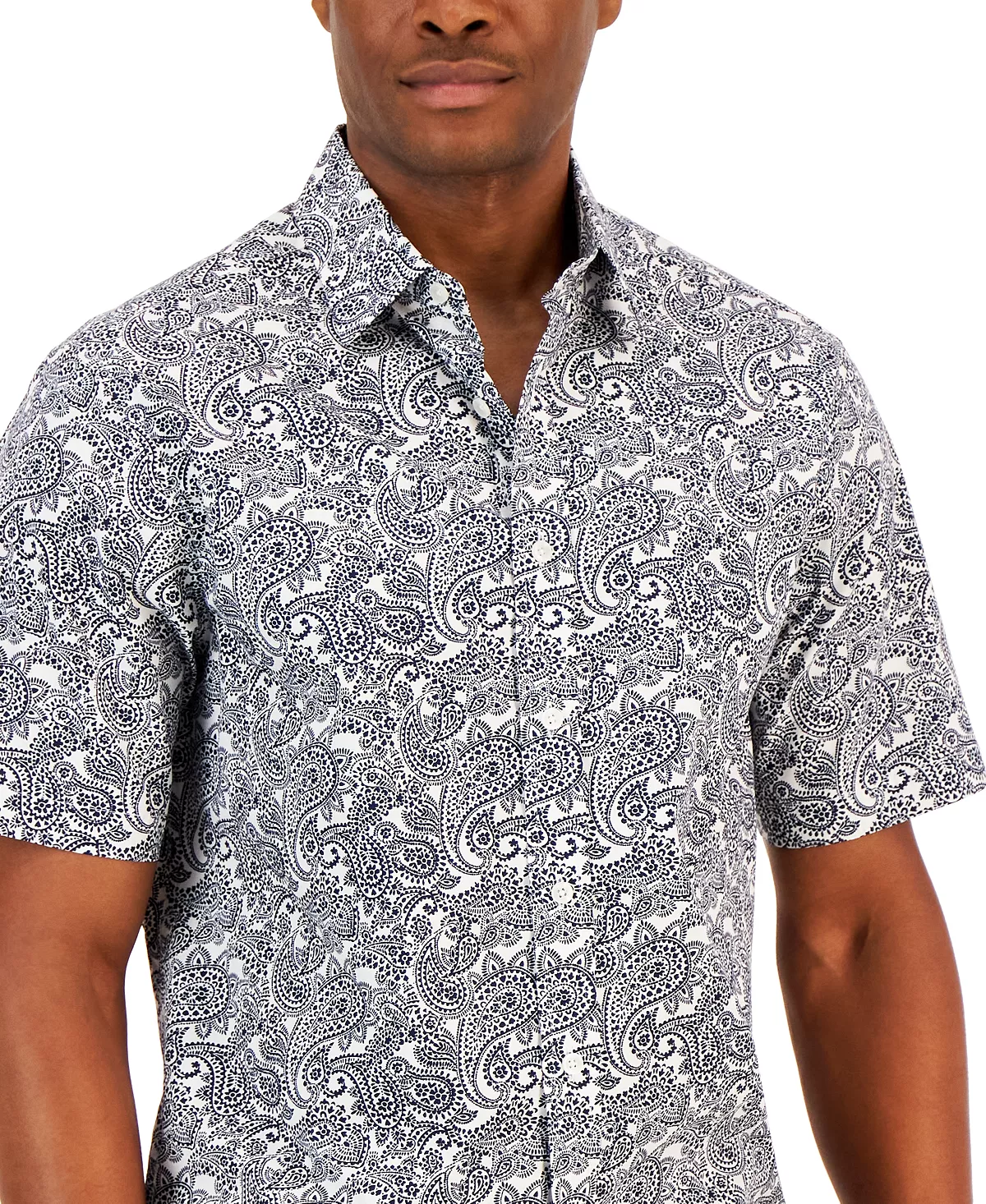 An allover paisley print gives this short-sleeve, cotton shirt from Club Room an eye-catching look that can be toned down with a layer.