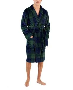 Effortlessly dress up your at-home lounge style with the Black Watch tartan plaid and sumptuous, plush feel of this pajama robe by Club Room.