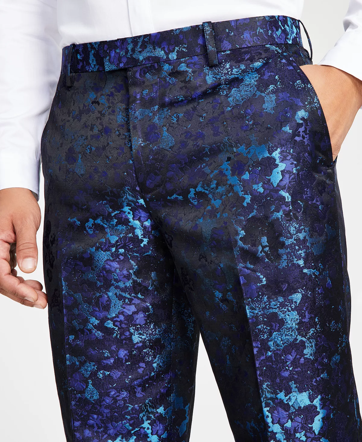 Add at touch of contemporary appeal to your polished look with the shimmering abstract brocade of these suit pants from INC International Concepts.