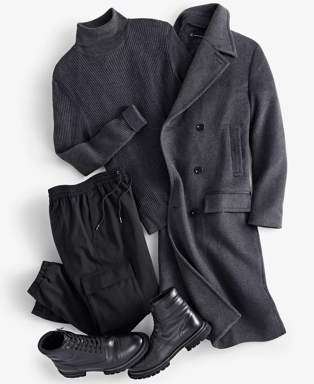 Go for a style that was born on the streets of London with this ensemble from INC International Concepts. Updated cargo jogger pants provide both comfort and retro-mod fashion when topped by a soft, turtleneck sweater while a double-breasted top coat makes for slick and refined metropolitan style.