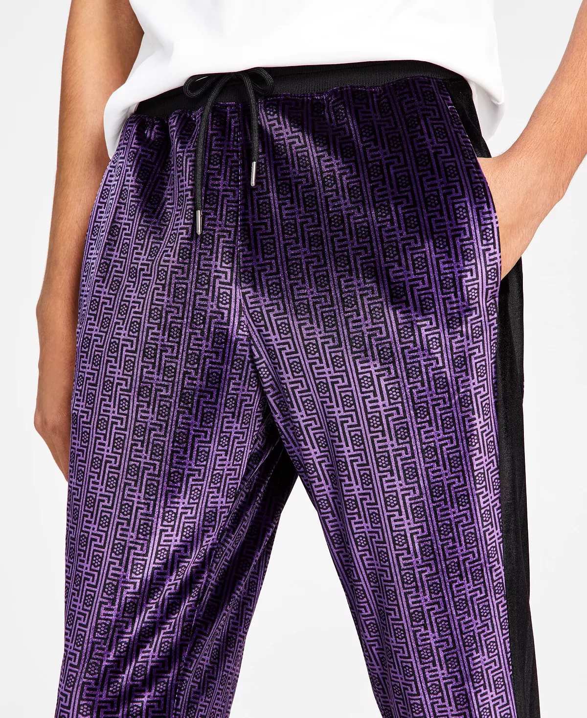 Bring a fresh modern feel to your sporty look with the rich velour fabric and eye-catching geometric pattern of these Gemini tracksuit pants from INC International Concepts.