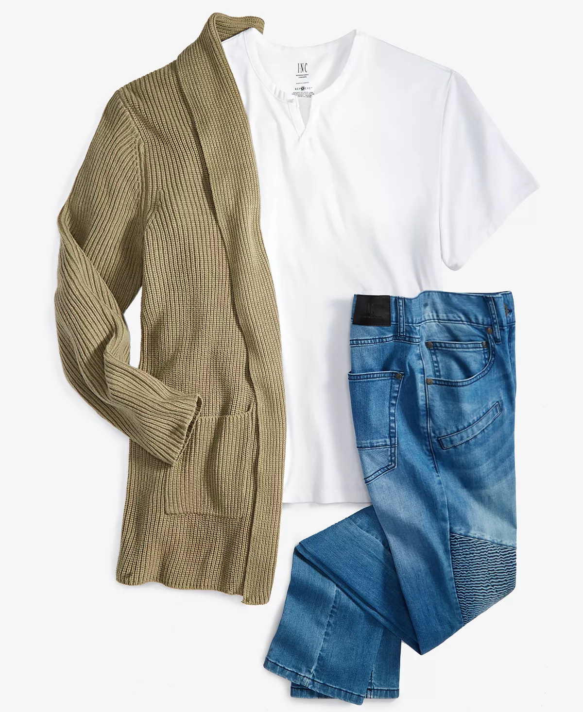 For an effortlessly cool casual look, choose the long ribbed-knit cardigan, split-neck T-shirt and skinny moto jeans featured in this contemporary ensemble from I.N.C. International Concepts®.