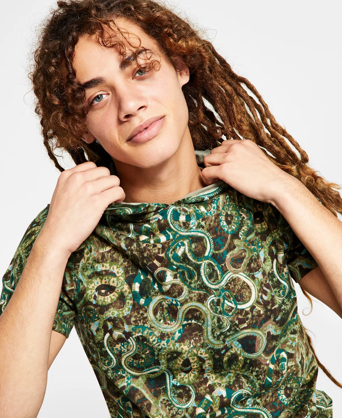 Add some striking style to your streetwear with the eye-catching pattern of slithering snakes printed on this comfortable hooded T-shirt from I.N.C. International Concepts®.