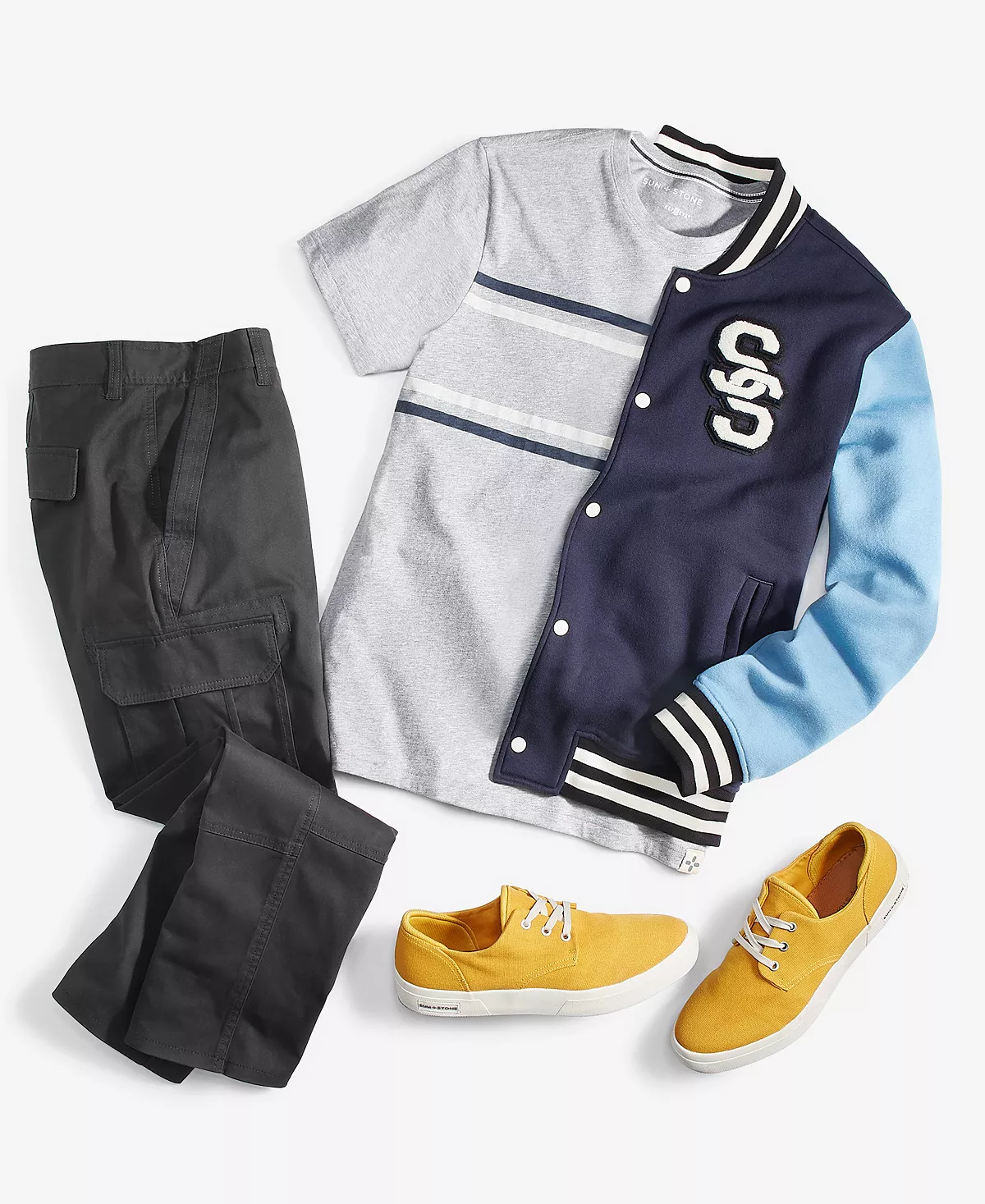 Hit the streets with a knockout ensemble when you gear up in this fleece bomber from Sun + Stone, layered to perfection with a classic striped T-shirt and cargo pants.