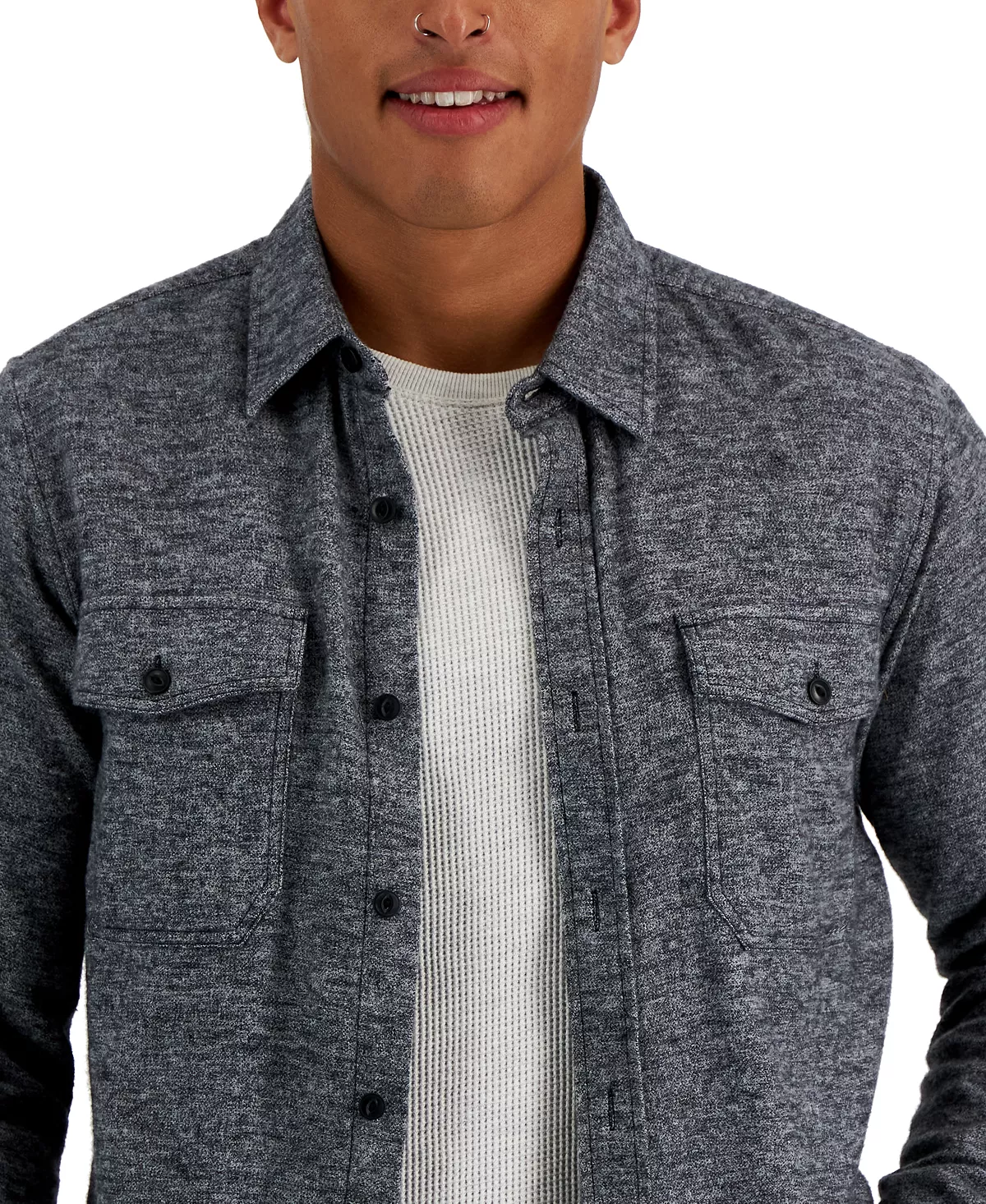 Sun + Stone dives into high style with the contemporary fit of this button-front shirt, showcasing a point collar and chest pockets.