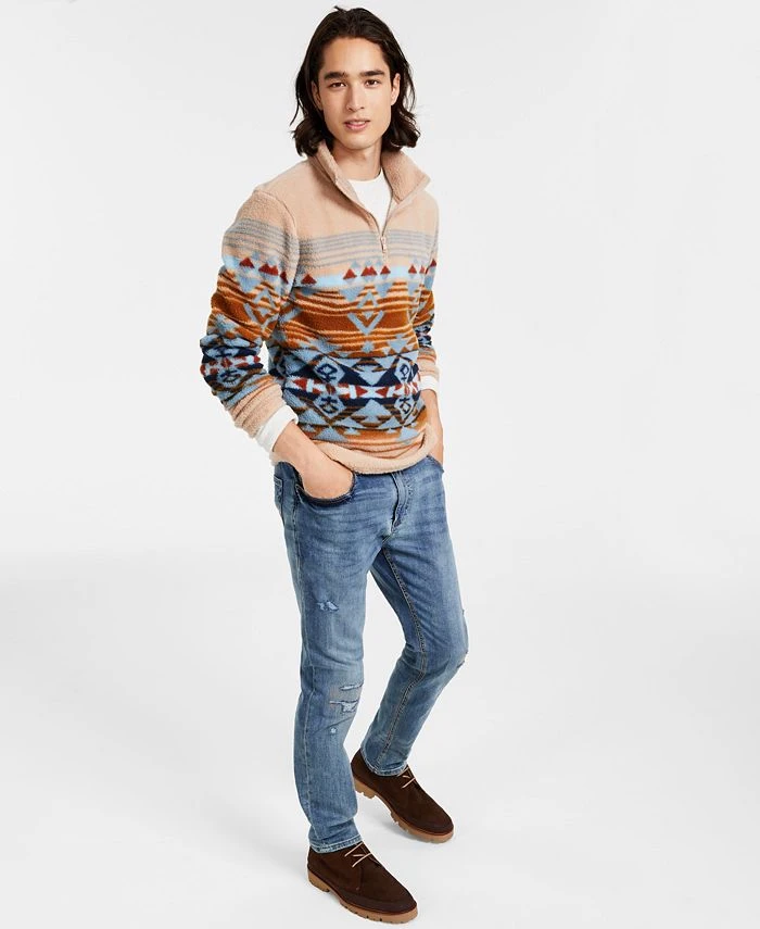 Sun + Stone highlights upscale style and casual comfort with a vibrant-printed sweater and straight fit jeans.